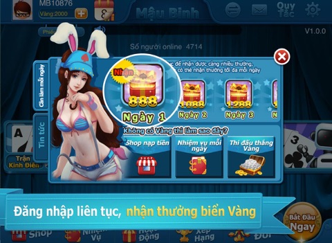 2. Phần thưởng mê người: mỗi ngày vào game nhận ngay Vàng, nằm trong Bảng xếp hạng Tài phú mỗi ngày đều nhận được phiếu đổi Thẻ Cào.