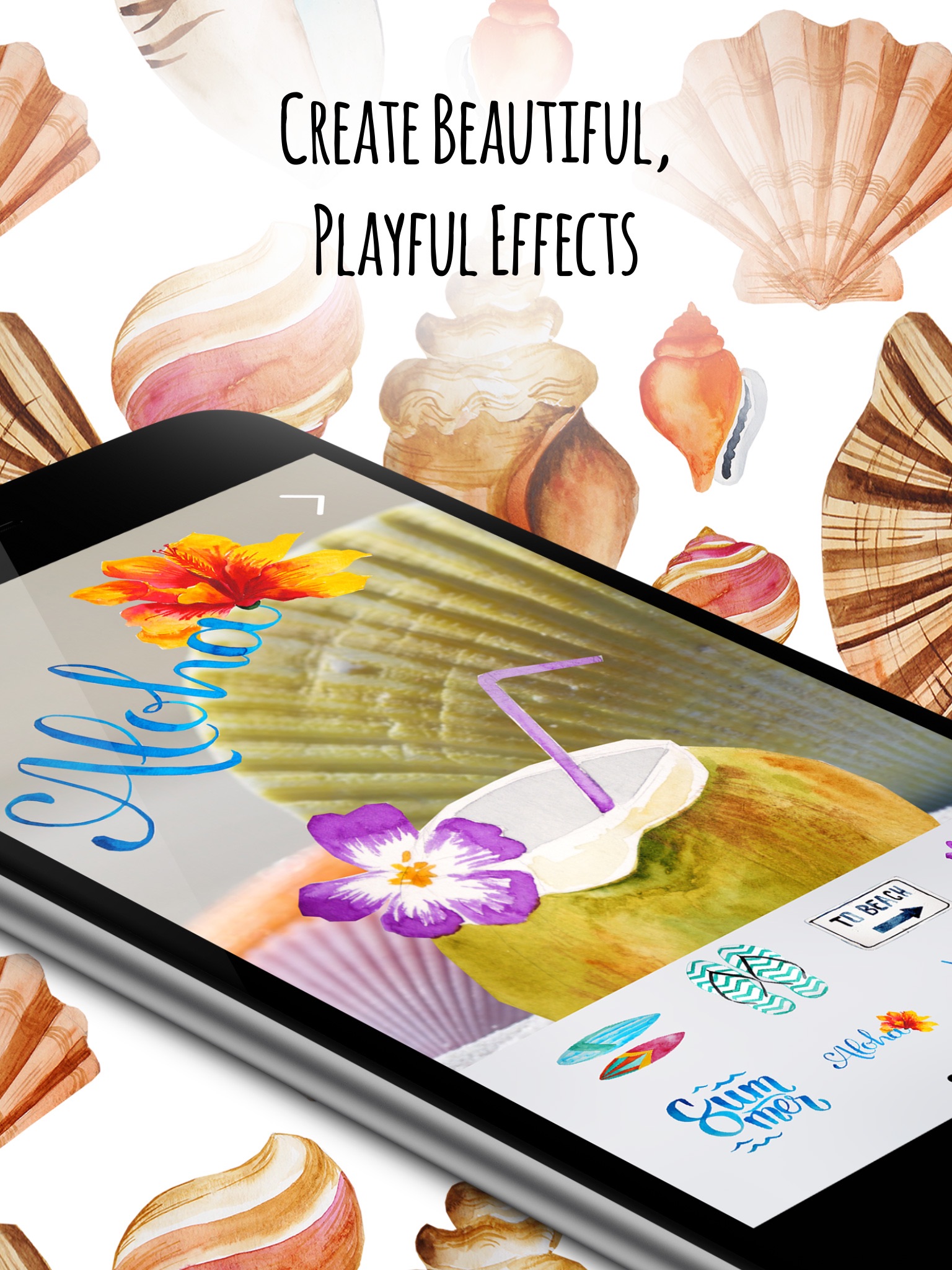 Make beautiful tropical photos with watercolor graphics. Share directly to Instagram, post on social media, or message your photos to friends.