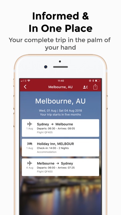 No longer will you need to rely on emails and printed documents. Maps, confirmation numbers, gate and terminal info, contact details and much, much more are now at your fingertips.