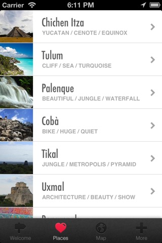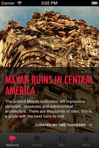 The app covers 15 Mayan ruin sites. Each site description is one paragraph long with high school-ish content, and one photo. Two of the photos are of a parrot and a waterfall, with no image of the associated ruins. The app links to the Wikepedia description for each site and youre much better off accessing that information directly. You can get many more images from a Google image search.