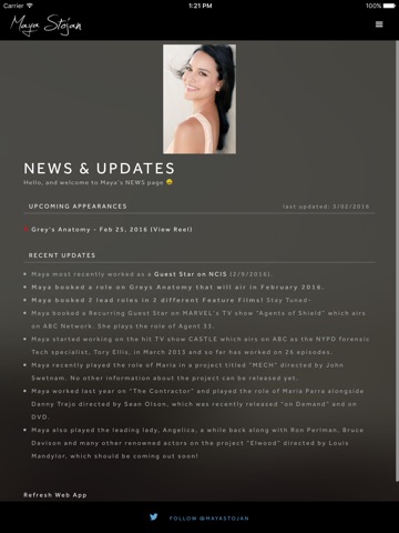 The Maya Stojan App is both a fan app and a professional app for the up and coming Hollywood actress.
