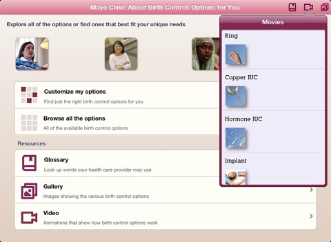 Put Mayo Clinics expertise about birth control options on iPhone or iPad. Mayo Clinic About Birth Control is an interactive tool that helps you get a better understanding of the different types of birth control and helps you select the best options for you. With Mayo Clinic About Birth Control, you can: