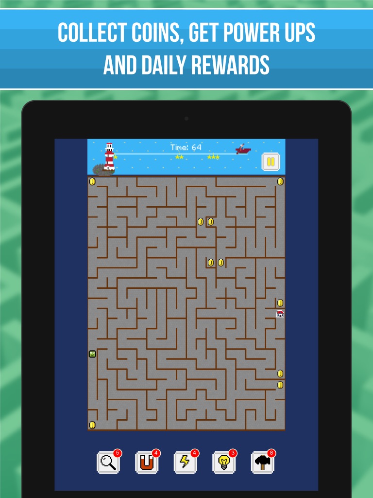 Find your way through the adventures land of Retro Maze - Fight the Dark World, Smash some Maze Walls, Sneak past the Evil Auto-Bots and much more... while solving a complicated maze puzzles to collect Coins.