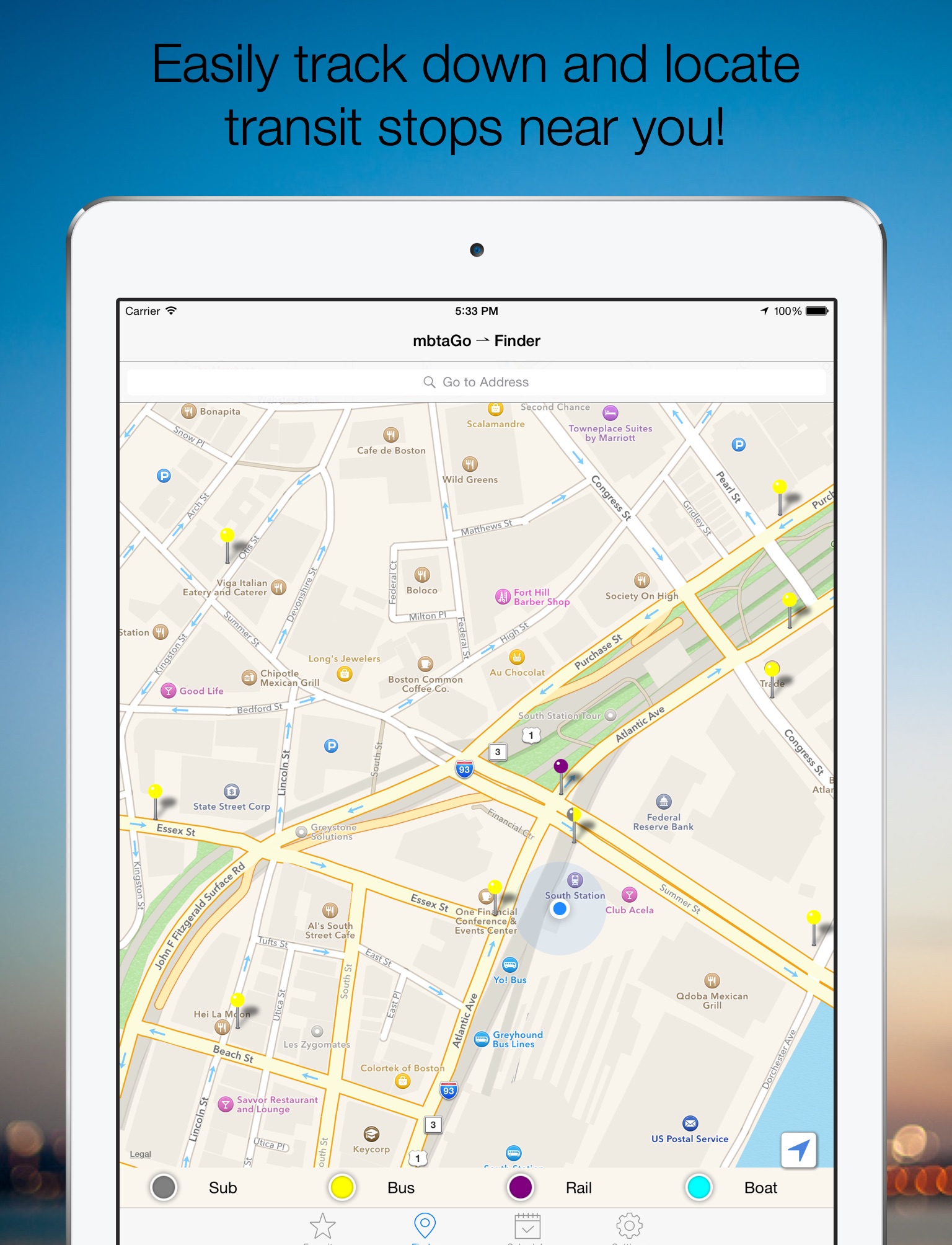 mbtaGo is your go to MBTA transit assistant and new best friend. Find out about arrival times and directions for all transit routes for all MBTA routes using real-time data.*
