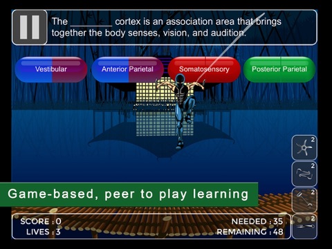 •After the successful completion of each level (need 70% to pass), the high yield facts tested are summarized in a few short sentences. Can play game anywhere! Game designed to be played in situations where normal study does not occur (i.e. as a passenger, on a plane, waiting in line at the grocery store, between classes, etc.)