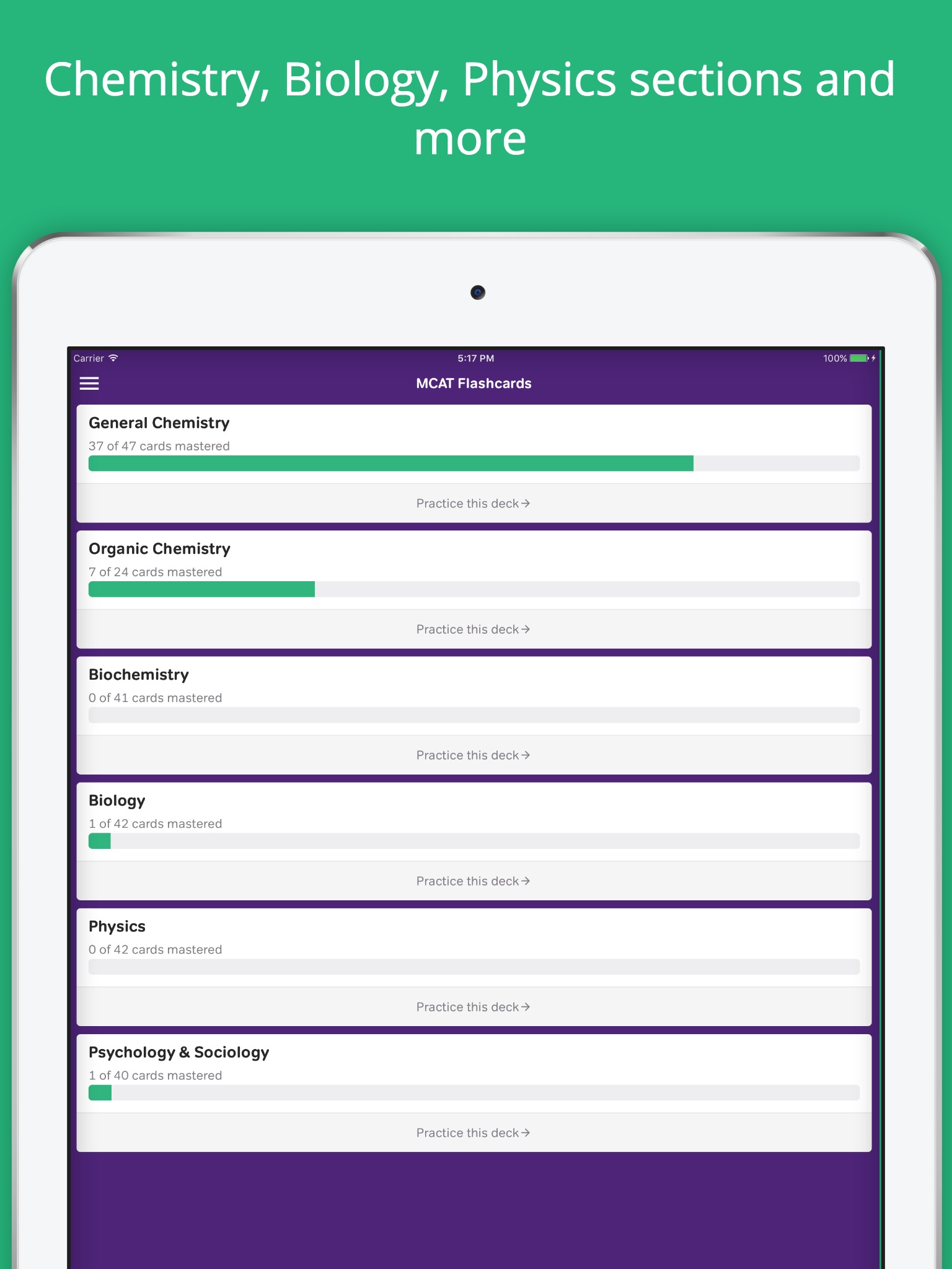 Get ready for the Medical College Admissions Test (MCAT) with this research-based MCAT Flashcards App. Study for the MCAT by quizzing you on the key concepts tested: General Chemistry, Organic Chemistry, Biochemistry, Biology, Physics, Psychology and Sociology. Take your studying on the go with MCAT Flashcards that are accessible without WiFi.
