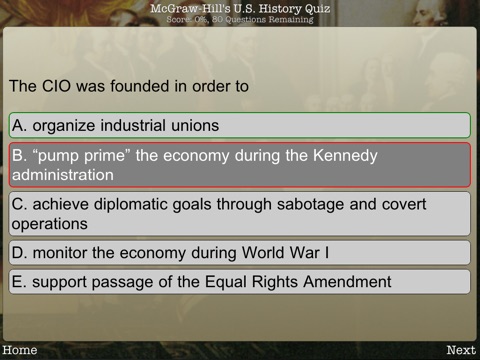 Designed to assess a users current knowledge of American history and based closely on the actual AP US History test given each year, this application consists of 80 multiple choice questions and provides detailed answers to each one. The application measures your progress as you go along and allows you to save your work, returning later to finish the test at your convenience. It also allows for repeated usage since, once completed, you can scramble the questions and take the test all over again. To minimize frustration, the application also allows the user to skip a question, returning to it at a later time.