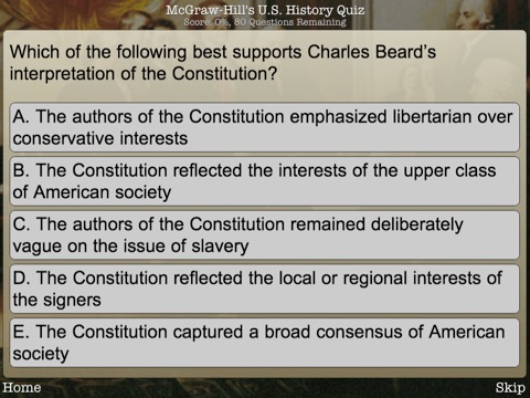 Designed to assess a users current knowledge of American history and based closely on the actual AP US History test given each year, this application consists of 80 multiple choice questions and provides detailed answers to each one. The application measures your progress as you go along and allows you to save your work, returning later to finish the test at your convenience. It also allows for repeated usage since, once completed, you can scramble the questions and take the test all over again. To minimize frustration, the application also allows the user to skip a question, returning to it at a later time.