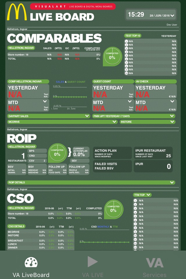 VA LIVEBOARD gives you control of your McDonalds restaurants. Business performance data from several databases, available 24/7, wherever you are worldwide. You will find information about sales, product mix, ROIP and Customer Feedback such as CSO information or VOC depending on regional agreements. Based on your role in the company you will see information only for the restaurants you have access to. You will need a valid McDonalds AD or EID to be able to use the app.