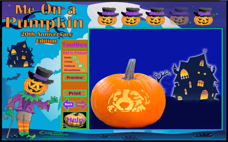 Simply load your digital picture or image. Crop, Rotate, Scale, Flip and Mirror if needed. Adjust the amount of detail to fit your carving comfort level – Beginner, Intermediate, or Advanced. You will then see the parts that would fallout of the pumpkin if you were to start carving right there. This is a huge time saver! We turn those pieces bright Red, you just add pumpkin back to make sure you dont ruin your pumpkin!