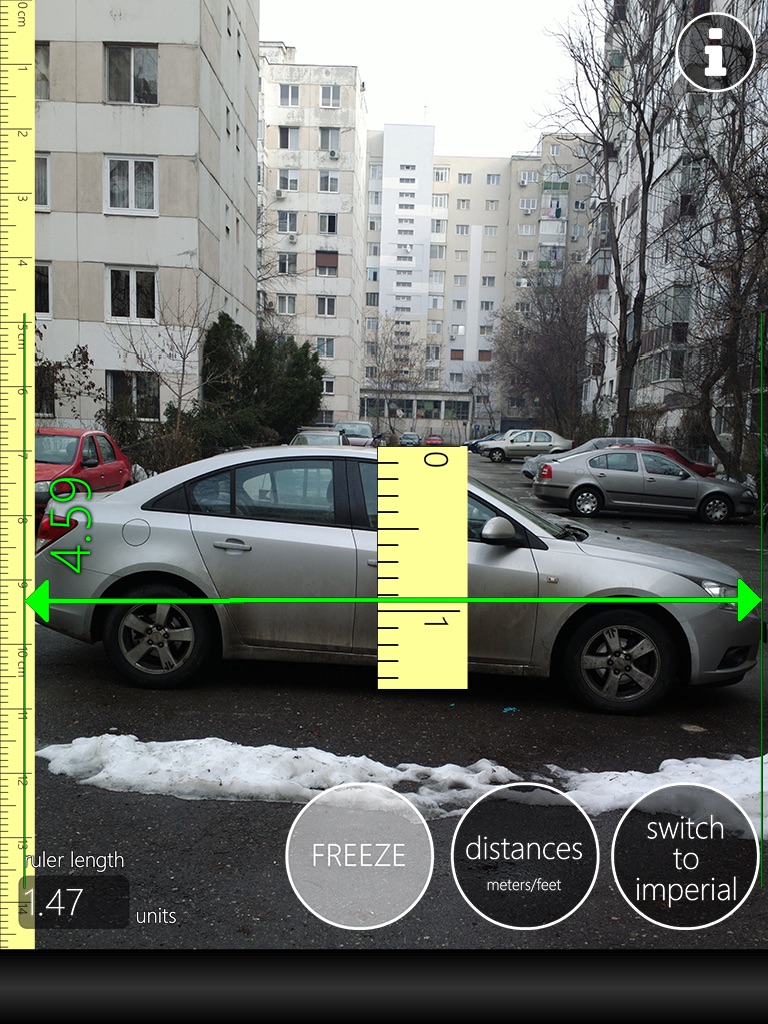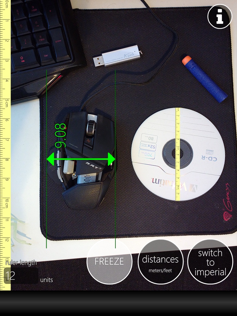 -measure large objects with help of augmented reality. fit a ruler on a know object on screen and star measure everything; for example make ruler of 12units and fit it on a DVD on your desk, and them you can measure any object from your desk, or fit a 2unit ruler on your doors house of 2 meters and then start measure windows roof floors. use FREEZE function for better usage - take a snapshot of what you fit/measure and the operate without image shaking