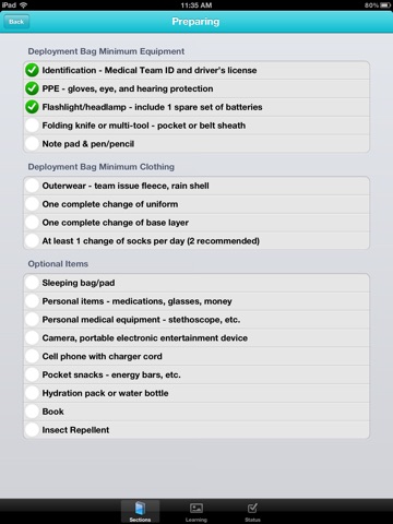 Med Field Ops provides quick access to all of the information contained in the Field Guide, including packing lists, deployment guidelines, treatment reference, and more.