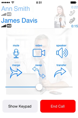 - Audio routing (Loudspeaker / Handset / Bluetooth / Wired Headset) / Mute;