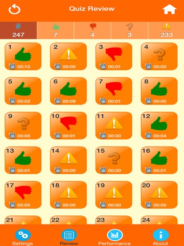 - View question order,correct,incorrect and achievements on quiz screen.