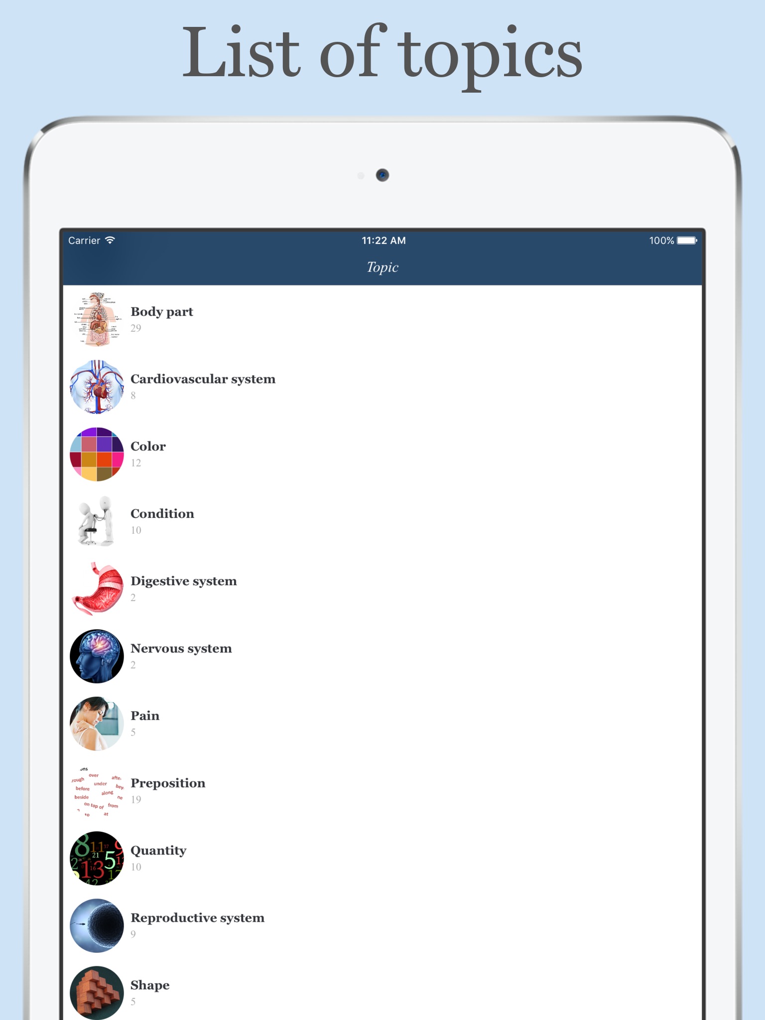 This app is designed to help you to learn a list of prefixes, roots, suffixes used in medical terminology, their meanings, and their etymology. Most of prefixes, roots, suffixes are derived from ancient Greek or classical Latin. Using this app will help you to easily remember medical terms.