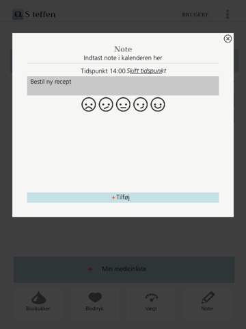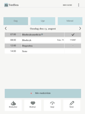 I kalenderen kan du få et overblik over dit daglige medicinforbrug. Du kan samtidig se, om du har taget din medicin som angivet. Du kan også tilføje dit blodtryk, blodsukker eller din vægt, og du kan skrive en note med en smiley, der angiver, hvordan din dag har været i forhold til f.eks. smerte eller humør.