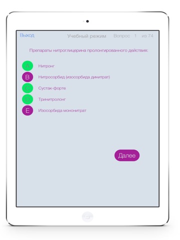 Задумка хорошая, давно такое искала. Но исполнение хромает. Не удобно переключить с одного режима на другой, приходится заново искать раздел. Есть смысловые ошибки, напр идиовентрикулярный ритм назван в одном вопросе номотопным, в другом - гетеротопным. И самое главное, в тестовом режиме часто повторяются последние варианты ответов, например e: снижение АД, f: снижение АД, g: снижение ад. Выбрав что-то одно , получаешь ошибку. В учебном режиме варианты ответов разные.