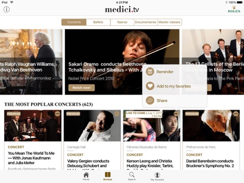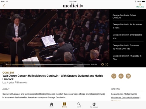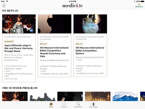 The medici.tv app lets you browse specially curated collections around different themes, prepared by our team of experts, and check out replays of our most recent livestreams. You can cast all our videos to your TV with Chromecast or AirPlay, add videos to your Favorites list for easy access, and enjoy HD-quality audio and video with no ads for an uninterrupted viewing experience!