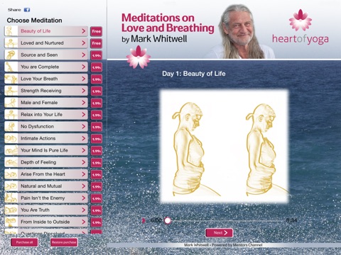 Mark Whitwell, world renowned Yoga Teacher and author of „The Promise of Love, Sex and Intimacy“ gives you in these 21 Meditations on Breathing all the practical spirituality that you will need for your everyday life. This application sponsored by Mentors Channel will teach you how to relax into the perfection that you are and change your life in 21 days or less