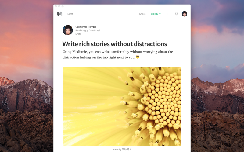 Use Mediunic to browse Medium without distractions, focus on the content and share your favorite stories through the share menu. The UI is unobtrusive and takes on the personality of your content for a true distraction-free reading and writing environment.