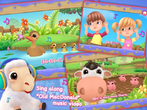 Enjoy watching and singing along "Old MacDonald" music video with karaoke style lyrics. Plus, "Whose sound?" educational bonus mini-game included.
