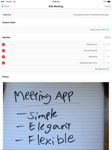 Good for basic minutes, but with a little work can be a great app. Needed to me more customizable and allow for default inputs like title, minutes taker, etc. right now you have to input all fields again. I cant get print function to work, but email works ok. Worth the purchase, but please polish this apps rough edges. Please update! Crashes all the time