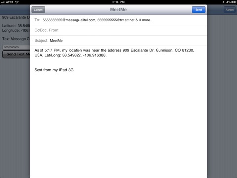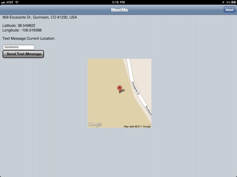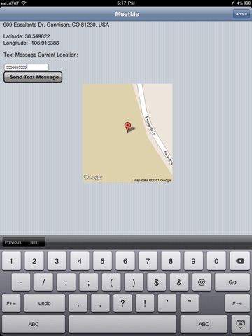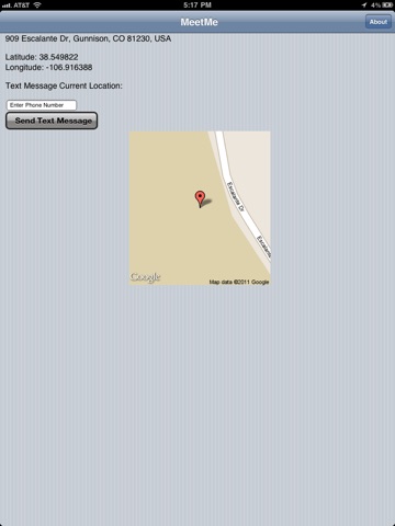 MeetMe lets you send your location to your contacts. Using the location technologies in your device, MeetMe finds where you are and defines your physical address to the current longitude/latitude. Type in the phone number of the recipient and MeetMe sends a SMS/text message to your contact!
