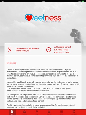 La nostra agenzia per single "MEETNESS" esula dal vecchio concetto di agenzia matrimoniale: lobiettivo principale è favorire la socializzazione tra persone che per le più svariate ragioni vogliono fare nuove conoscenze, per costruire un rapporto di coppia duraturo ed entusiasmante, o semplicemente per trovare degli amici con cui trascorrere il tempo libero.
