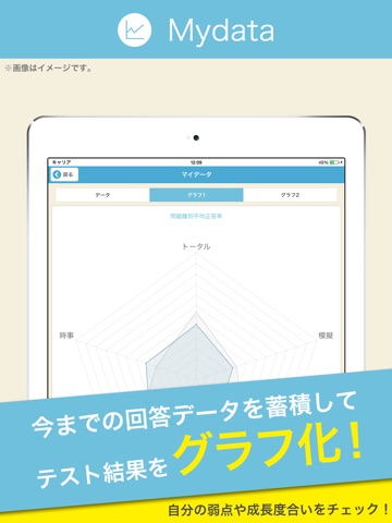 試験問題を解いた成績はグラフで表示されます。グラフの偏りを見ることで、自分の苦手分野が一目で確認することが可能です。問題を解いた成績は記録されてグラフ化されるため、解き続けることで自分の成長度合いを実感することができます。