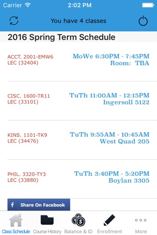 • Class Schedule for latest term, with days, times, & rooms. Share it on Facebook or Twitter.