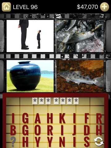 Look at the four pictures and figure out the movie title. All levels have pictures that when put together form a movie title. You don’t even have to know the movie! Use the provided letters to spell the title.