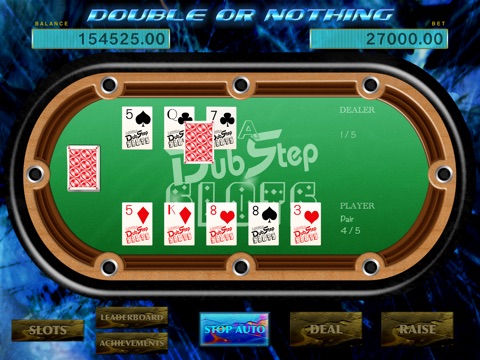 Dubstep "Double or Nothing" 5-Card Poker Room with Auto Dealer & All In bet options. Play Dubstep Poker with any of our 38 background tracks. Raise your bet or go All In to double your money! Beat the dealers hand and win that Dubstep Poker Jackpot!