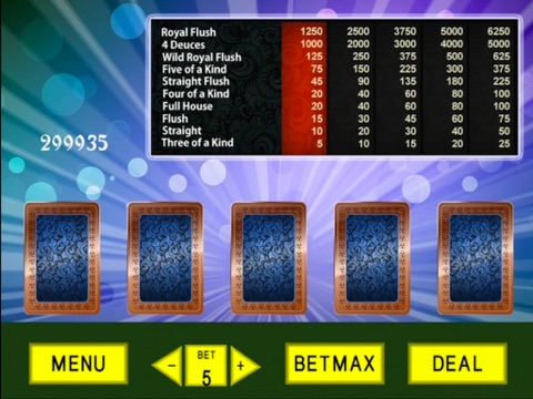 video Poker is a simulated casino poker game. A players goal is to obtain a poker hand from 5 randomly displayed cards. This game requires two deals to be considered a WIN. Credits are given on a WIN as per pay table. A player can hold the favorable cards of the first deal to make the strategy to win the game; cards can be held by selecting the card image or lock buttons.