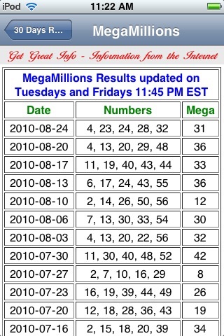 Also, as you would expect, this App provides the results and the current Jackpot amounts for these Lottery games. With one tap, you get a glance of the results of theses two games. Do a Date Search to find the results for any day back to May 17, 2002 for MegaMillions and November 5, 1997 for PowerBall. You can also do a search by numbers and find out how often they came out and when they came out. Finally look at the results of your favorite game for the last 30 drawings.