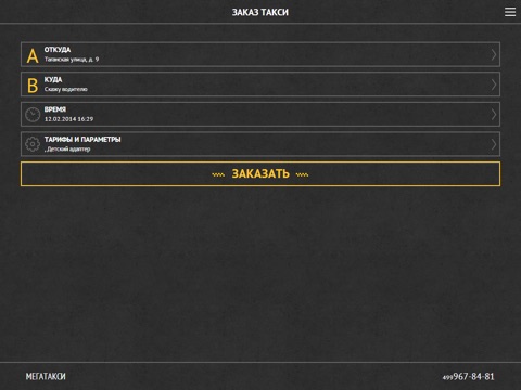 - быстрый заказ такси по двум полям "Откуда" забрать и Номеру телефона