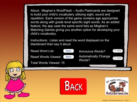 Meghan’s WordFlash is designed to build your child’s vocabulary utilizing sight, sound and repetition. Each version of the game contains age appropriate words along with grade level specific sight words. As an added feature, the app uses the same word lists as Meghan’s Matching Games giving you another option for developing your child’s vocabulary.
