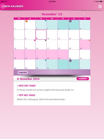 Die personalisierte Agenda verfolgt alles im Zusammenhang mit Ihrem Zyklus: Ihre Menstruation, die fruchtbarsten Tage und den Eisprung.