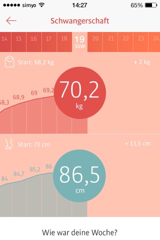 Ich finde die App für ein paar kurze Infos zur Woche prima, und auch die Ratschläge, die man nachlesen kann, gefallen mir. Mir gefallen auch die Abbildungen der Entwicklungsstände gut, und die Funktion für das Fotoalbum. Ich würde mir noch ein paar mehr Infos zum Körper der werdenden Mütter wünschen, es passiert ja doch viel...