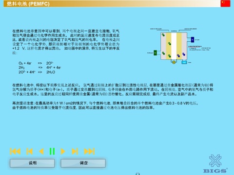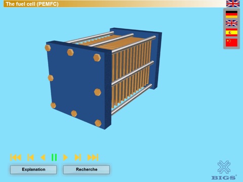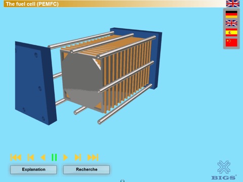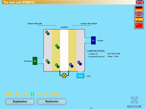 In this app by BIGS, the function of a fuel cell (PEMFC) is clearly depicted. The animation shows the structure of a stack and the electrochemical reactions, the way to get electrical power via oxygen and hydrogen.