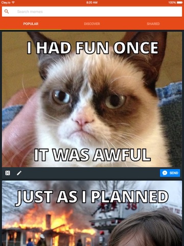 It has good potential, but the app is so slow Im surprised it never crashed on me. Not only is it slow, but it lags to catch up and is glitchy through the process of creating a meme. Side note: It seems the app has a total of 5 pictures that are used regularly and perhaps 3 more that are rare. Option of pictures, few.