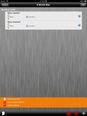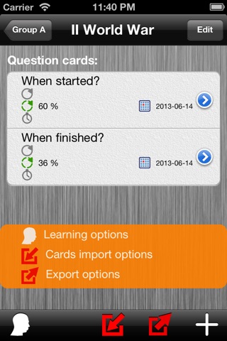 Memo+ Lite saves your question cards in groups on two levels, keeping you organized. The levels are: