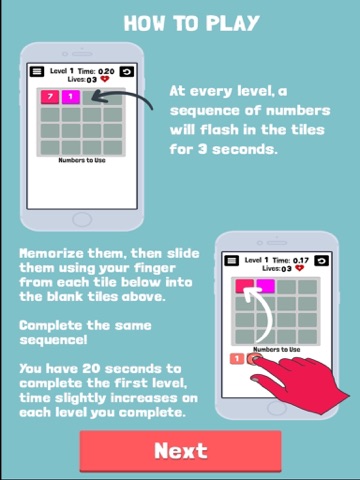 At every level, a sequence of numbers will flash in the tiles for 3 seconds. Memorize them, then tap or slide them, using your finger, into the correct blank tile space. The aim is to complete the same sequence in the order you saw them at the start. You are given 20 seconds to complete the first level, with time slightly increasing on each new, harder level. Levels start with 2 numbers, progressively increasing one at a time, so it becomes more and more difficult to challenge your short term memory skills.