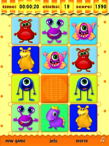 Initially you will see all cards turned face down. Tap on one of the card and remember the picture on it. With the next tap try to find and flip the card with the same picture as previous one. If the pictures on the both cards will be the same they will stay opened and you can continue with the next pair. Otherwise both cards will flip back over and you will get another try. Try to find all matched cards with few clicks and time as possible to get more scores!