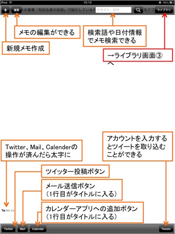 *それぞれのメモにはTwitter投稿・メール送信・カレンダーアプリへの追加済みを示すマークが付く。