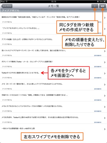 ◎各メモの内容は、後からでも自由に編集可能、タグ付け、タグの付け替えも自由にすることができる。