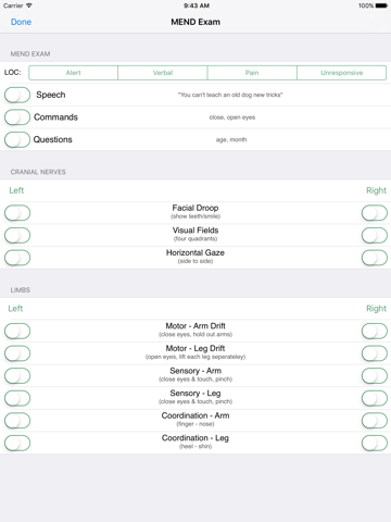 - The patient’s history, including age, sex, chief complaint, and time last seen normal, is recorded. The components of the MEND exam are provided in a checklist format and automatically scored from 0-22; up to 3 sequential MEND scores are recorded.