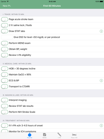 The MEND Hospital (Hosp) application helps hospital providers to detect and manage stroke patients. The application is divided into tabs that allow the user to navigate the following: the first 60 minutes of caring for an acute stroke patient; the MEND exam with sequential scores for monitoring; t-PA indications and contraindications for the 3-hour and 4.5-hour windows; t-PA dosing; and post-t-PA care. Users are prompted to indicate whether there is a new patient, or whether they wish to resume entering information on an existing patient.