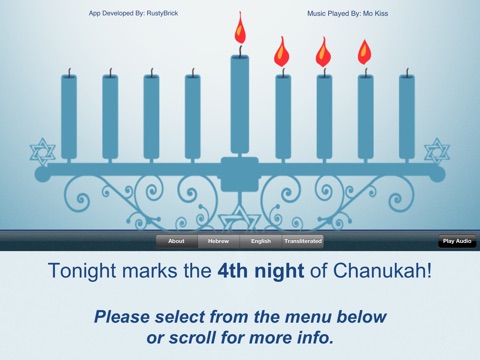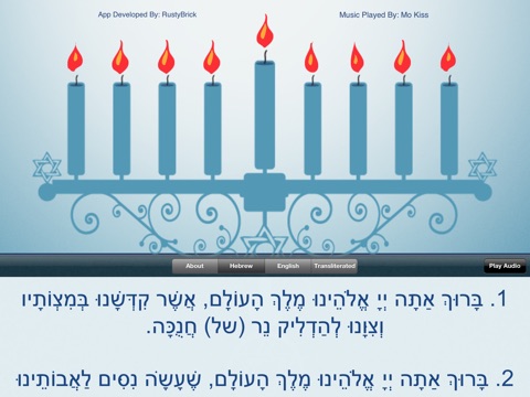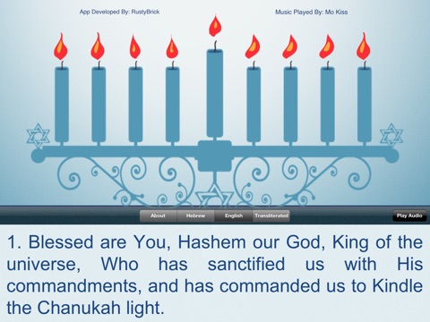 This iPhone Menorah will show you how many candles to light for each day of the Jewish Holiday Chanukah (Hanukkah). It has a cute animation, that shows you which way to light, in accordance with the Ashkenaz customs. It also has the Chanukah prayers in Hebrew, English and Transliterated. Plus, we have the prayers professionally and beautifully sung by Mo Kiss. We hope you enjoy this free iPhone app during Chanukah! It is RustyBricks present to you!