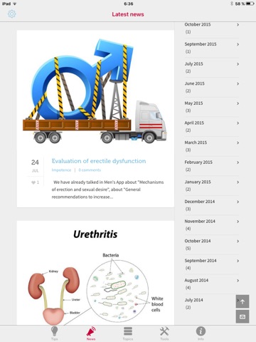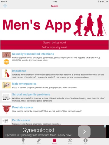 In Mens App our aim is to provide information about common conditions in simple language for everybody. You will also find some useful tools: 1) Ask a doctor; 2) Drinking self-assessment; 3) Test your prostate symptoms; 4) Track your PSA; 5) BMI calculator; 6) See your last body measurements and vitals in your Health app or register new data (iOS HealthKit integration); 7) Get help to stop smoking; 8) Sexual health self-assessment. Remember that you can use Mens App as a tool to understand, learn, prevent, or get advice, but it should never be a substitute for a visit to your doctor.