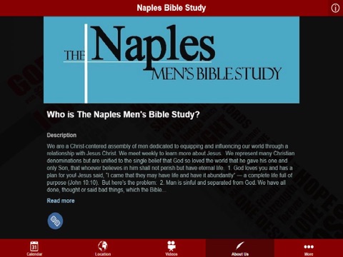 The Naples Mens Bible Study App is a convenient way to learn more about the Bible. We devote a lot of our time and energy to integrating Biblical stories with the challenges of real life. This free app offers the most recent videos from our Bible Study, as well as the weekly audio sessions from our leader, John Garippa. Embedded in the app is a link to the Garippa Foundation site which offers additional online resources. For those of you that are in the Naples, Florida area we have added other features such as the automated calendar and map functions.